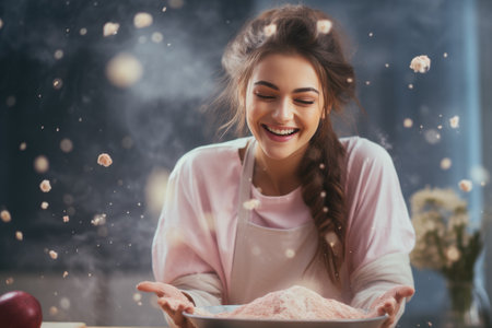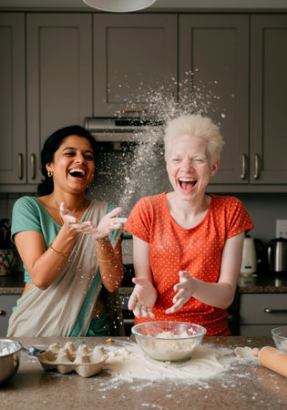 Two women having fun baking in kitchen, throwing flour in air, laughing joyfully. Home cooking and friendship concept.