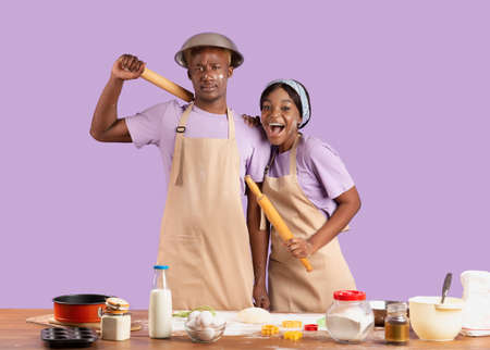 Playful African American couple with cheeks covered in flour holding rolling pins, having fun while baking, lilac studio background. Positive guy and woman being silly while cooking together