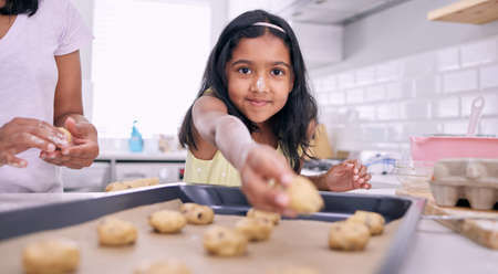 Chocolate chip cookies are my favourite. Shot of an adorable little girl placing cookie dough on a baking tray.