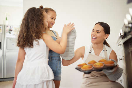 Baking, mother and children in kitchen, happy and smile together, bonding and child development. Portrait, mama and girls learn skills, loving and child care for fun, joyful and daughter at home.
