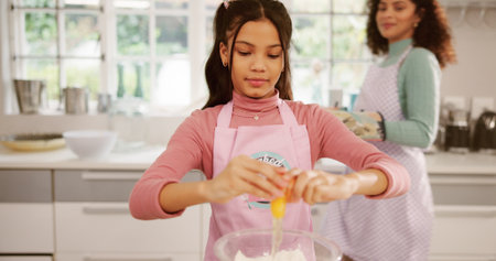 Baking, eggs or learning with mother and daughter in home kitchen together for pastry recipe. Cooking, cracking and ingredients with single parent woman teaching girl child how to bake in apartment