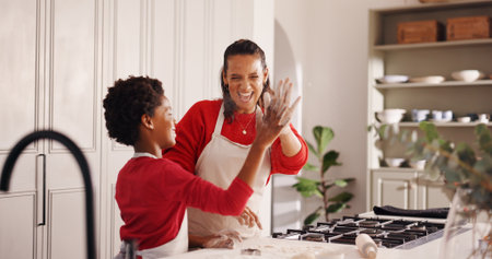 High five, baking and mother with child in kitchen for christmas cookies, dessert or cake together. Happy, cooking and mom teaching boy kid with celebration for festive biscuits with bonding in home.