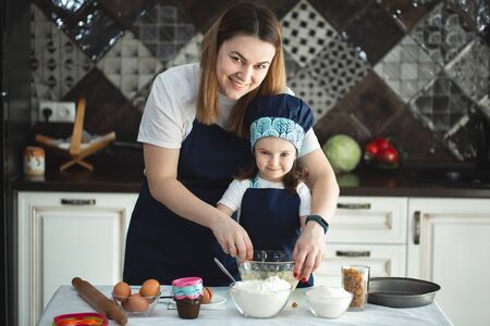 Mom and little daughter are preparing dough together in a bowl in the kitchen. Happy family preparing pie cake ingredients while having fun baking holiday morning at home.