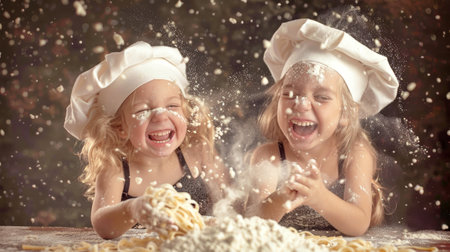 Two joyful girls in chef hats laugh while cooking pasta, flour flying around as they bond over a playful kitchen experience.