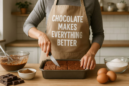 Woman wearing apron cutting freshly baked chocolate brownie cake into squares in kitchen with ingredients on wooden table