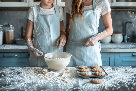 A mother and daughter mixing ingredients in a bowl during baking cookies. AI generative