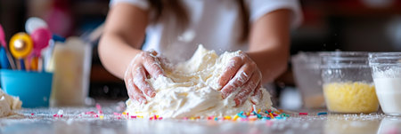 Close Up of Hands Mixing Cake Batter in a Bright Kitchen, Surrounded by Sprinkles and Baking Tools