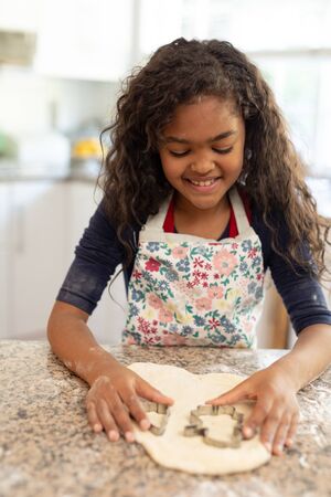 Front view of a young mixed race girl in a kitchen at Christmas, making cookies and cutting out shapes