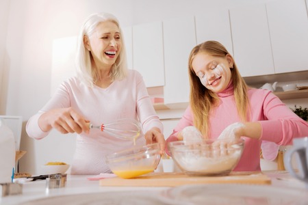 Happy positive aged woman looking at her granddaughter and smiling while enjoying cooking together with her