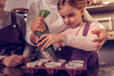 For special pastry. Selective focus of a green pastry bag being in hands of a nice cute girl
