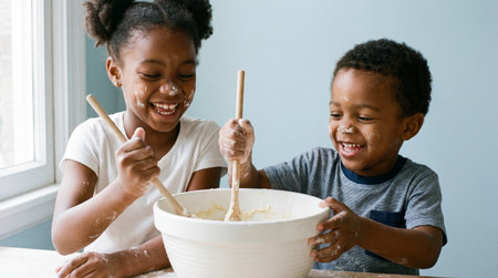 Two joyful children baking together in a bright kitchen, laughing as they mix batter in a large bowl with wooden spoons and flour on their faces.