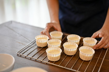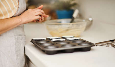 A female baker baking cupcakes in her kitchen, preparing a cupcakes flour in a cupcake cases. cupcake recipe concept. close-up image