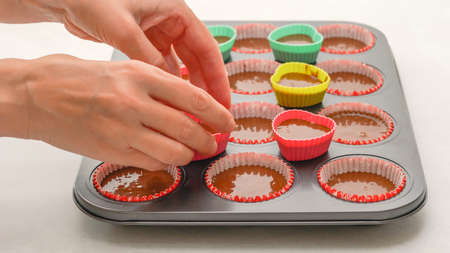 Flat lay. Lining cupcake pan with paper cupcake liners.