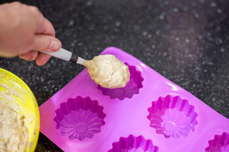 Close up of boys hands holding a spoon puring dough on the small cake molds in the kitchen. Delicious food. Food preparation. Sweet food.