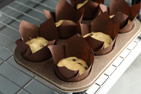 Paper cases filled with muffin dough baking in oven. Making of muffins with raisins. Homemade baking. Step for making muffins, pie, biscuit. Baking process step by step.