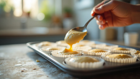 A hand delicately pours golden batter into cupcake liners nestled in a baking tray, surrounded by a cozy kitchen atmosphere. The warm light and soft focus evoke a sense of homey comfort, perfect for baking enthusiasts and sweet treat lovers.