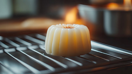 A delicate gelatin dessert sits on a cooling rack in a softly lit kitchen, showcasing its smooth texture and inviting appearance for culinary enthusiasts.