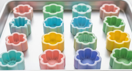 Colorful flower-shaped silicone molds on baking tray for creative cooking