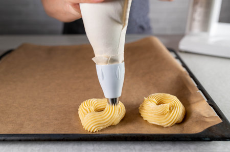 Cook squeezes the dough onto baking sheet. Cooking eclairs. Homemade pastry.