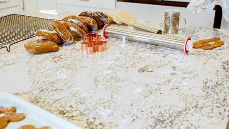 In a contemporary white kitchen, gingerbread cookie dough is skillfully rolled out, setting the stage for a delightful holiday treat.