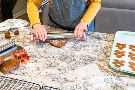 Using an adjustable rolling pin to roll out gingerbread cookie dough on the elegant marble counter in a modern kitchen, getting ready for festive holiday baking.