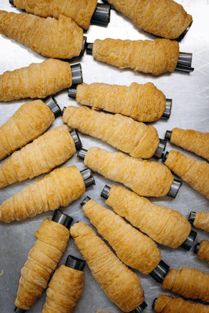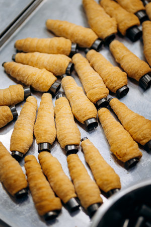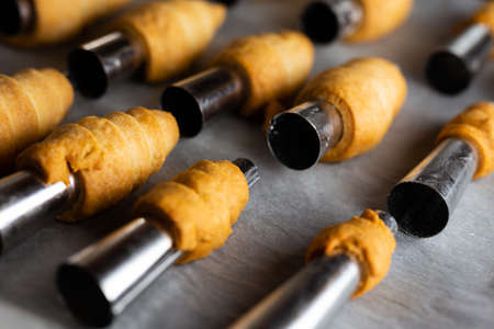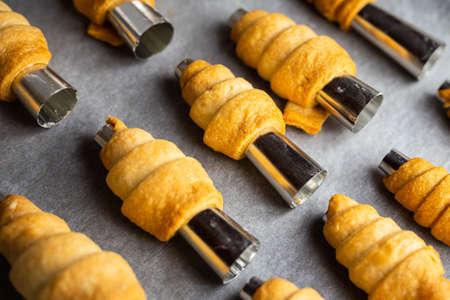 Raw puff pastry tubes for cream rolls on metal tray in bakery kitchen