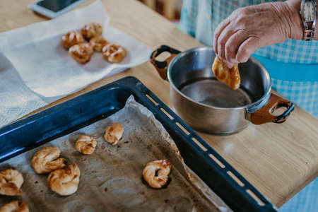 Grandmother greases bagels with an egg while preparing bakery at the kitchen