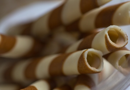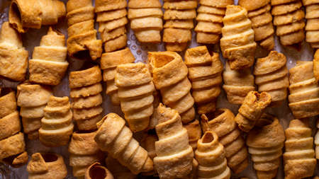 Lots of sweet home made confectionery tubes prepared to be filled with cream. Photo taken under soft artificial light.