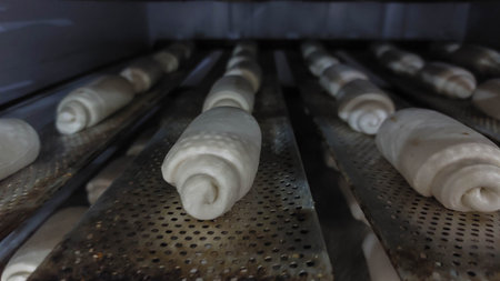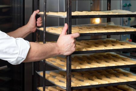 Unbaked puff pastry tubes on tray ready for cream filling in bakery kitchen