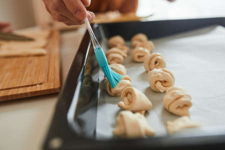 Closeup on smearing buns with egg yolk with pink kitchen brush