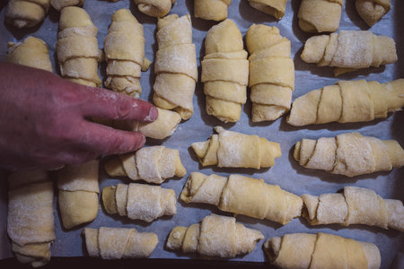 Vanilla crescents before baking. Vanilla rolls. Roll pastry cookie. sliced rolls of dough roll. cookie dough on a parchment paper, selective focus