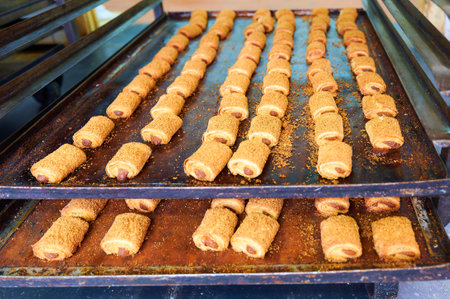 Baked rolled pastries with sweet filling cooling on trays in a warm kitchen after a busy baking session