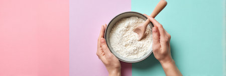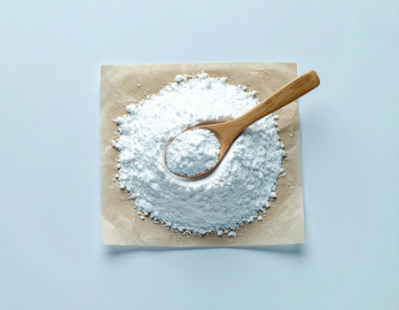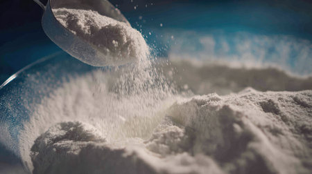 This image showcases a close-up view of white powder being poured from a spoon into a shallow dish, set against a blue background. Ideal for cooking and baking themes.