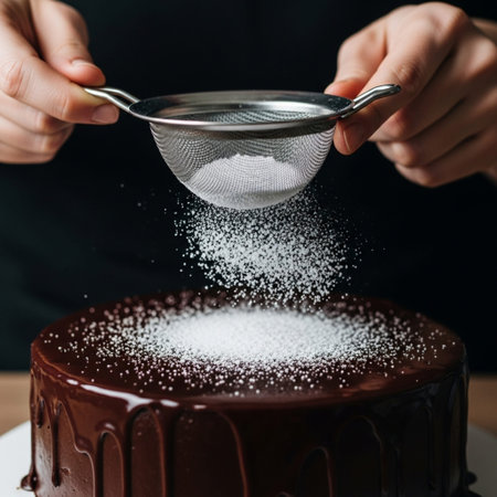 Person adds flour to a pastry through the strainer. Vertical studio shot.