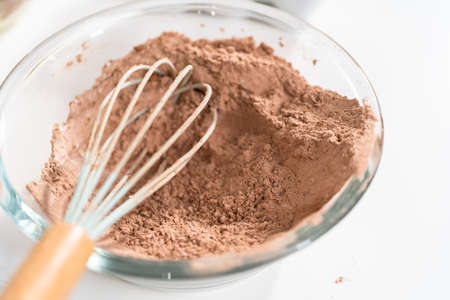 Mixing ingredients in a glass mixing bowl to bake chocolate cookies.