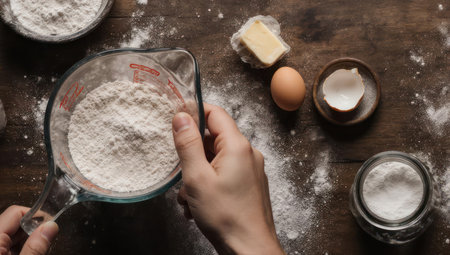In the quiet of a rustic kitchen, a baker's hand gently dusts flour into a bowl, a cloud of white powder caught in a dramatic light.
