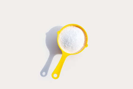 Detergent powder with measuring spoon for clothes washing. Laundry concept.