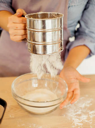A young woman sifts flour through a sieve, for dough, baking, cake, pie. modern kitchen. close up.