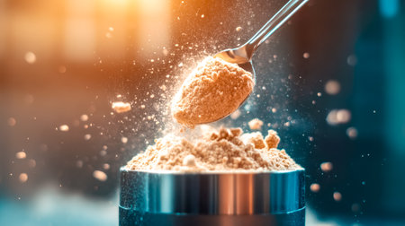 Spoon pouring whey protein powder into shaker for sports nutrition
