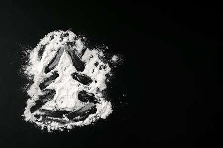 Christmas tree made from flour on a black background with copy space