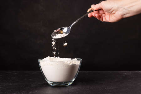 Female hand pouring flour into bowl with spoon on black background, closeup