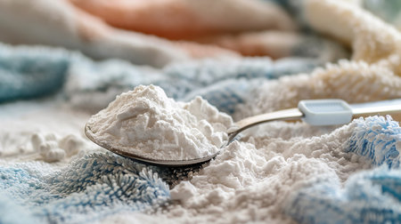 Detergent powder in measuring spoon on cloth background