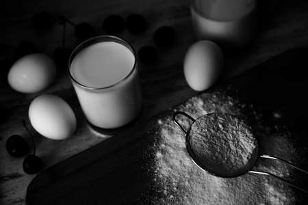 Black and white photo of flour in metal strainer, eggs. milk and berries