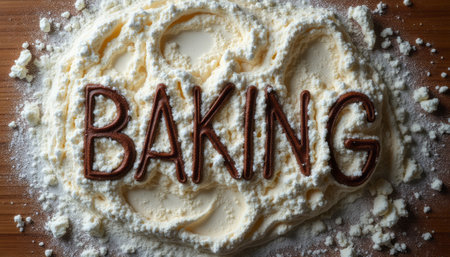 A playful arrangement of flour and chocolate letters spelling BAKING creates a delightful and inviting atmosphere in the kitchen. This image captures the joy and creativity of baking, showcasing the fun of making treats with a touch of whimsy.