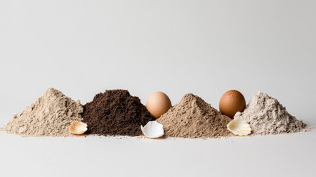 A visually appealing arrangement of assorted natural powders and eggs on a light background, ideal for culinary projects, recipes, and creative presentations.