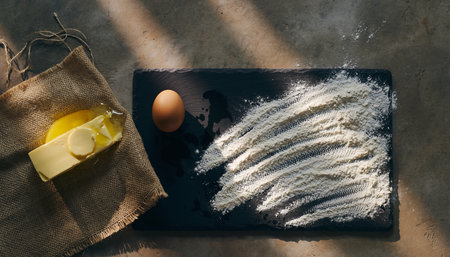 Overhead view of baking ingredients including flour egg and butter on a dark slate with sunlight casting shadows