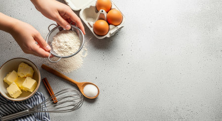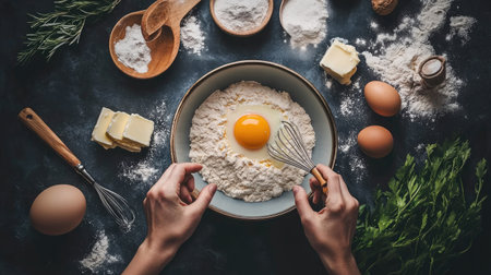 Overhead shot of baking ingredients including flour, eggs, and butter, with hands stirring flour in a measuring cup.