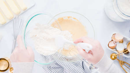 Step by step. Flat lay. Mixing ingredients in a glass bowl to make chocolate chip cookies.