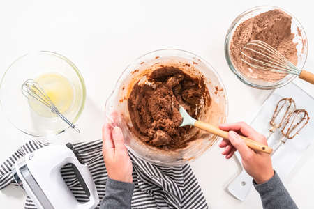Step by step. Flat lay. Mixing ingredients in a glass mixing bowl to bake chocolate cookies.