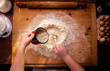 Ingredients for baking - flour, wooden spoon, rolling pin, eggs. Woman hands kneading fresh dough